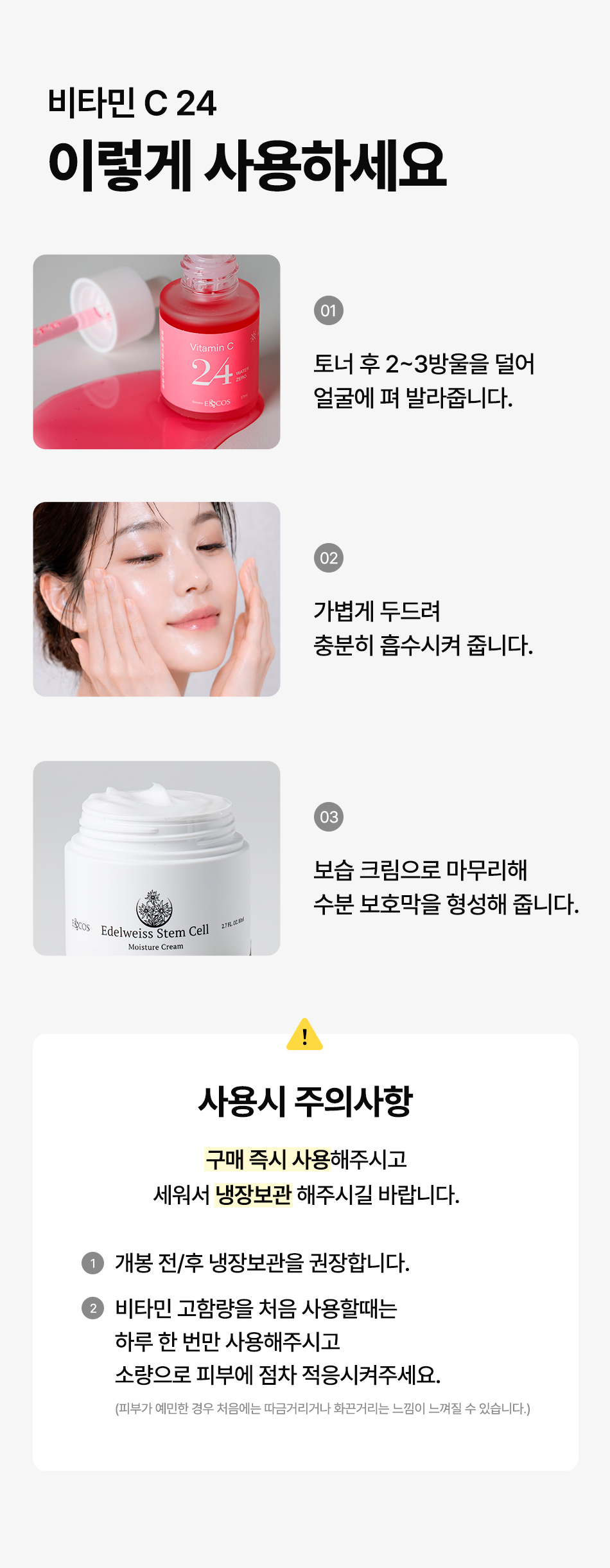 | 사용시 주의사항 | 1. 화장품을 사용하여 다음과 같은 이상이 있는 경우에는 사용을 중지하여야 하며, 계속 사용하면 증상이 악화되므로 피부과 전문의 등에게 상담할 것. 2. 상처가 있는 부위,습진 및 피부염 등의 이상이 있는 부위에는 사용을 하지 말것. 3. 보관 및 취급시의 주의사항. - 사용 후에는 반드시 마개를 닫아둘 것. - 유아/소아의 손이 닿지않는 곳에 보관할 것. - 고온 또는 저온의 장소 및 직사광선이 닿는 곳에는 보관하지 말것. | ||